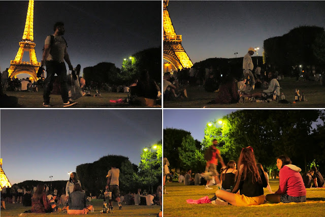 Harap dicatat, bukan saya doang yang lebay ya, momen mulai menyalanya lampu Eiffel ini memang ditunggu-tunggu para pengunjung. Sampe-sampe ketika kejadian itu beneran dateng, orang-orang pada tepuk tangan dooong. Sesudah lampu menyala masih ada atraksi cahaya lain. Ada saat-saat di mana sejumlah titik lampu menyala lebih terang dan membuat Eiffel tampak lebih gemerlap. Cakeplah pokoknya. Memandangi Eiffel di malam hari adalah salah satu kegiatan yang paling asyik saat di Paris.