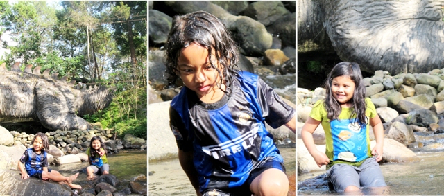 Tempat ini cocok buat camping bersama anak kecil. Soalnya semua lokasi tertata rapi. Jembatan berbentuk komodo menyambut pengunjung yang mau menyeberangi sungai menuju lokasi buka tenda. Lana dan Keano sampai bolak balik terus melewatinya.