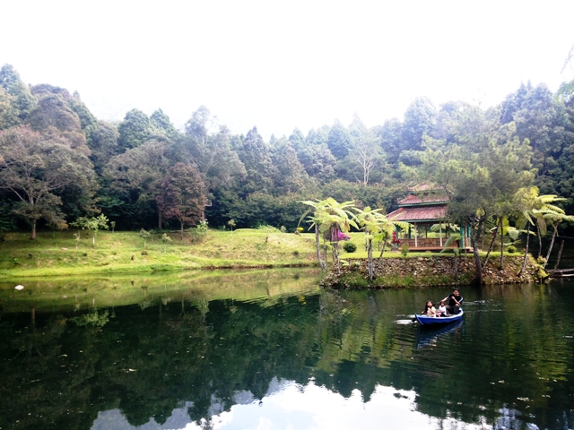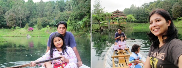 Menghabiskan sore di Mandalawangi bisa dengan berperahu keliling danau. Satu perahu bisa dinaiki sekeluarga. Berperahu di tengah danau yang dikelilingi rimbunnya pohon, jadi inget adegan action di film Mandarin. Tinggal tambahin caping yang menutupi muka sama baju silat, persis adegan pendekar di perjalanan dalam suatu misi entah kemana hehehehe… Saya lupa pernah nonton adegan itu di film silat yang mana. Males juga inget-ingetnya karena terlalu banyak film action Mandarin yang udah saya tonton.