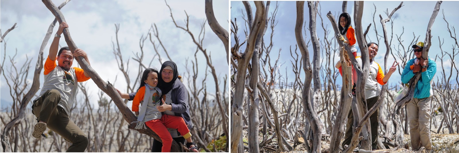 Dari Pondok Salada, kami menuju Hutan Mati. Disebut demikian karena lokasi ini dipenuhi pohon-pohon yang meranggas akibat erupsi Gunung Papandayan. Bekas-bekas aliran lava menghasilkan lahan kering, dipenuhi debu dan kerikil berwarna keputihan. Semua pohon mati menjadi tonggak yang bentuknya artistik. Ini spot yang harus dilalui menuju puncak papandayan.