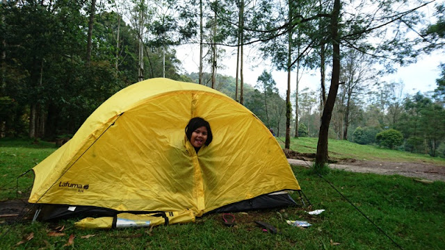 Waktu ke sana, kami memang memilih buka tenda dekat dengan jalan mobil. Penyebabnya, kami sampai sudah sekitar jam 10 malam. Kondisi saat itu gerimis dan kabutnya pekat banget. Penerangan di gerbang buper juga minimalis, alias gelap sama sekali. Pos masuk udah nggak ada yang jaga. Saking gak keliatannya jalan, kami sempat berhenti menunggu kabut agak reda. Bermodal nekad kami ikuti aja jalan masuknya. Begitu gerimis selesai, langsung buka tenda di area pinggir jalan. Patokannya, ada juga tamu lain yang udah buka tenda di dekat situ. Begitu perlengkapan bobok beres, langsung rebahan dan kami tidur sampai pagi.
