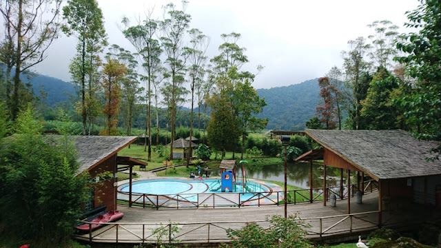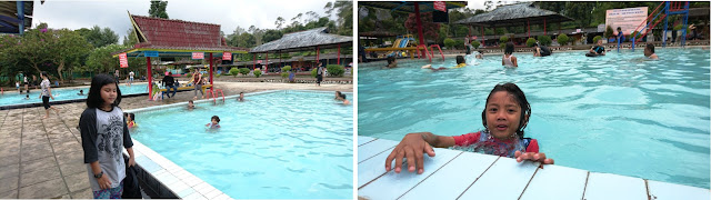 Sementara di sebelah tempat outbond ada kolam renang air panas. Bentuknya macam waterpark versi mini. Buat yang kedinginan camping di sini, mandi di kolam ini bisa jadi pilihan. Tentu saja pengunjung harus bayar lagi untuk menikmati fasilitas ini. Meski sempat tergoda, kami sekeluarga memilih menunda mandi pagi itu. Sebagai gantinya kami jalan-jalan keluar buper dulu. Dari awal, incaran kami untuk main air atau berenang memang bukan di sini. Tapi di Ciwidey Valley.
