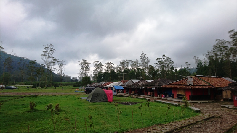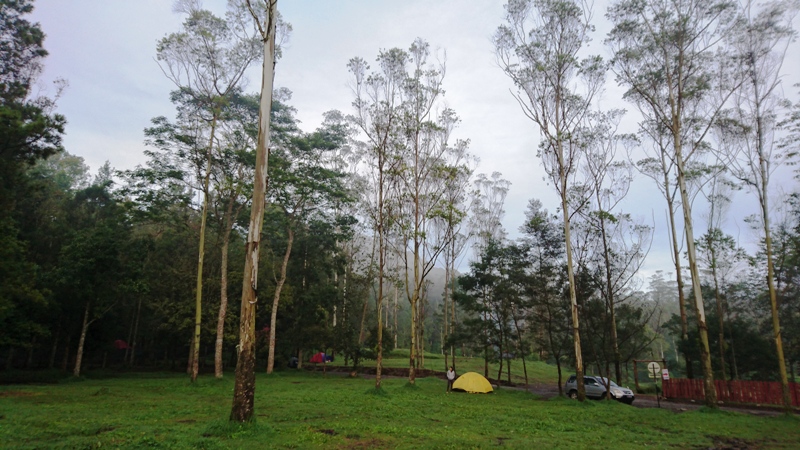 Waktu ke sana, kami memang memilih buka tenda dekat dengan jalan mobil. Penyebabnya, kami sampai sudah sekitar jam 10 malam. Kondisi saat itu gerimis dan kabutnya pekat banget. Penerangan di gerbang buper juga minimalis, alias gelap sama sekali. Pos masuk udah nggak ada yang jaga. Saking gak keliatannya jalan, kami sempat berhenti menunggu kabut agak reda. Bermodal nekad kami ikuti aja jalan masuknya. Begitu gerimis selesai, langsung buka tenda di area pinggir jalan. Patokannya, ada juga tamu lain yang udah buka tenda di dekat situ. Begitu perlengkapan bobok beres, langsung rebahan dan kami tidur sampai pagi.