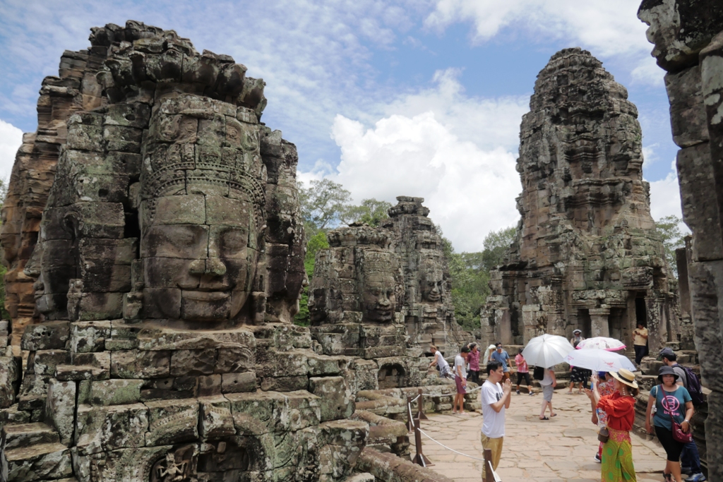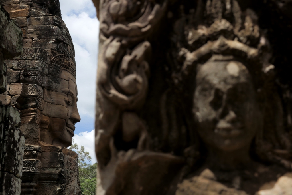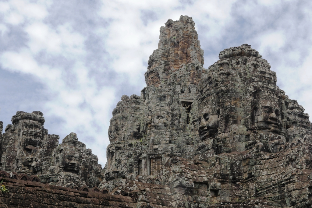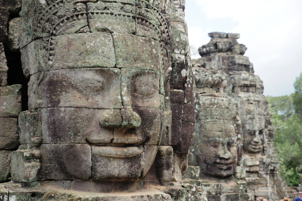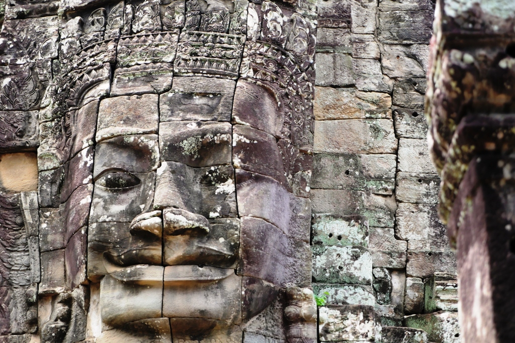 Wajah-wajah yang terukir berukuran besar di Candi Bayon adalah wajah Avalokiteshvara yang sedang tersenyum. Jumlahnya ada 216, menghiasi 54 menaranya. Avalokiteshvara adalah perwujudan welas asih Sang Budha.