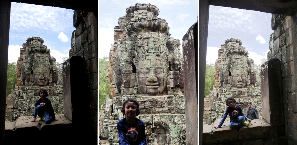 Dibanding Angkor Wat, luas Candi Bayon jauh lebih kecil. Keseluruhan situs bentuknya persegi. Tapi walaupun kecil, bisa saja kalau terpisah rombongan bisa cukup lama ketemunya lagi. Ada sedikit tips nih, simpel tapi penting. Diingat-ingat ya.. masuknya dari mana ketika datang, biar gak tersesat waktu keluar mau pulang hehehe.. Sebab sekilas, dari 4 penjuru, situs Candi Bayon kelihatan sama. Itu juga yang membuat kami sekeluarga terpisah, karena saya lupa di mana bagian depan candi, kalau tidak bisa dibilang tersesat hahaha…