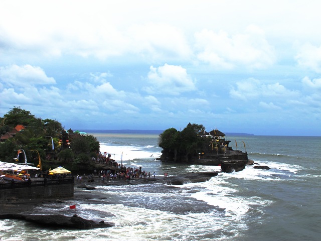 Sebagai ikon pariwisata Bali, Tanah Lot tetap jadi tujuan favorit wisatawan. Gak heran kalau hari itu Tanah Lot ramai sekali. Objek yang paling menarik di sini tentu saja adalah Pura Luhur Tanah Lot, yang berada di atas karang dan agak jauh dari bibir pantai. Untuk ke pura ini, harus memperhatikan datangnya ombak dan menunggu air surut. Cukup banyak wisatawan hari itu yang menyeberang ke pura. Kami turun ke pantai, tapi gak menyeberang ke pura. Anak-anak hanya melihat pura dari bibir pantai sambil bermain air laut.