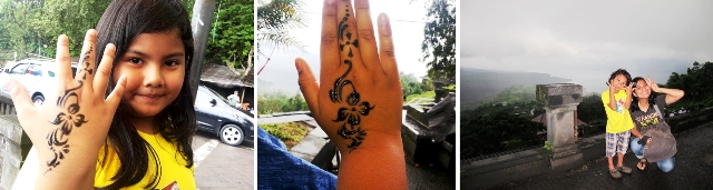 Cuaca yang kurang mendukung disertai turun hujan, membuat kami hanya bisa menikmati Gunung dan Danau Batur dari Penelokan. Memang gak ada juga niat misalnya buat trail adventure, atau down hill bike di Gunung batur. Rencana buat turun saja dan menyeberang ke Trunyan melihat desa dan cerita mayat digeletakan di bawah pohon, kami singkirkan. Kami hanya duduk di tenda-tenda, sambil melihat pemandangan Danau Batur, bersama penjual-penjual lainnya  yang juga ikut berteduh. Jajan, beli buah-buahan, dan eyang beli kaos gambar Kintamani buat oleh-oleh mba Ipah di rumah. Lana sempat ditato henna atau diukis dengan daun pacar.