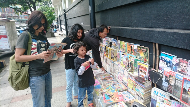 Kenyang makan baso, kami ke alun-alun. Pengenlah nyobain lapangan rumput sintetis yang ngehits fotonya di berbagai medsos. Parkir susah, karena ada pengajian. Jadinya, kami parkir di jalan Cikapundung. Deket sih, tinggal jalan kaki ke alun-alaun. Yang menyenangkan, turun parkir ada penjual buku dan majalah bekas. Sempat mampir dan liat-liat koleksinya yang amazing. Ada majalah Nina coba, yang populer banget waktu saya SD. Ada komik Donal Bebek versi jadul, komik Spiderman, Superman, dan kami membeli beberapa.