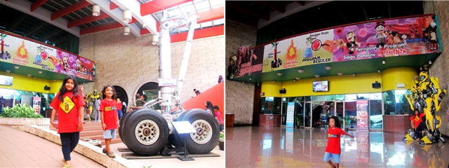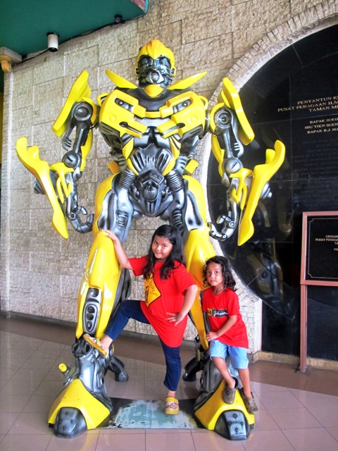 Efek Transformers The Ride, wahana hyper–realistic 3D di Universal Studio Singapura, yang menggabungkan kecanggihan roller coaster dengan animasi 3D, masih berasa sampai pulang. Jadi pas lihat foto dan ingat ada robot kuning di TMII yang mirip Bumblebee, segeralah meluncur manfaatin libur wiken. Sebelum-sebelumnya gak pernah lihat dan ada niat, buat masuk ke museum PP-IPTEK TMII ini. Taman Mini emang jadi salah satu tempat favorit, dan alternatif kami kalau libur pendek. Relatif dekat, variatif, dan murah. Bolak balik ke TMII, biasanya kami lebih sering main mainan kaya sepeda air atau bebek-bebekan, naik gondola, monorail, istana anak, atau ngadem sambil botram di bawah rumah adat di anjungan Aceh.