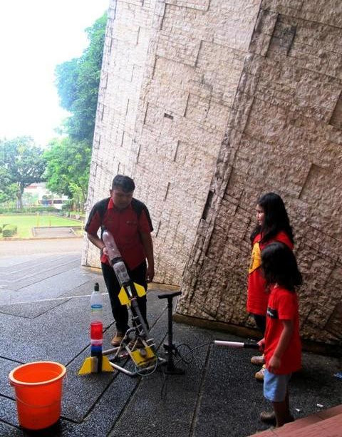Demo sains yang juga terjadwal di PP IPTEK TMII adalah peluncuran roket. Roket air. Roket ini dibikin dari botol plastik bekas, sejenis botol minuman soda yang 1,5 liter, yang disambung-sambung jadi berbentuk roket. Terus roket ini diisi air dan dipompa biar biar ada tekanan buat meluncur. Giliran Lana yang pompa, dan Keano yang pegang tombol peluncurnya. Seneng banget roketnya berhasil meluncur tinggi sampai ke tempat parkiran mobil.