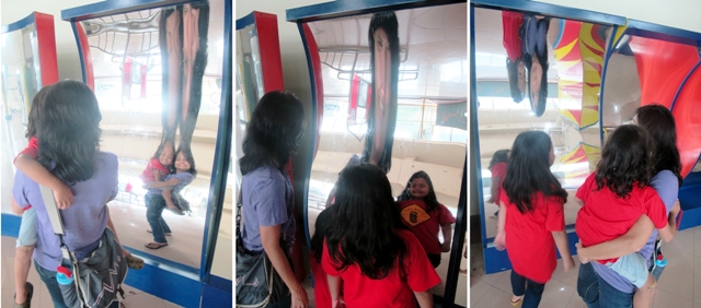 Kaki mulai pegel, tapi hasrat untuk main masih menggebu. Tanggung juga masih banyak yang mau dicoba. Salah satunya ke area optik dan cahaya. Di sini kami nyoba buktiin adanya efek tipuan mata atau optical illusion. Seperti di rumah-rumahan yang kalau diintip di luar lewat celah intip, di dua posisi yang beda, akan kelihatan beda ukuran. Selain itu, ada juga kaca atau cermin cembung dan cekung.