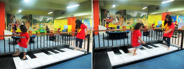 Gak selesai di roket, masih banyak lagi wahana di sini. Selanjutnya ke Arena Peneliti Cilik dan Kids Corner. Begitu masuk ketemu labirin kaca, lorong-lorong bercabang dan berkelok, dengan kaca-kaca di dindingnya. Ada juga alat musik yang terbuat dari pipa warna warni. Yang paling disukai anak-anak di sini, adalah piano lantai atau piano injak. Lantai yang diwarnain kaya tuts piano, yang kalau diinjak ngeluarin bunyi nada doremi kaya piano beneran.