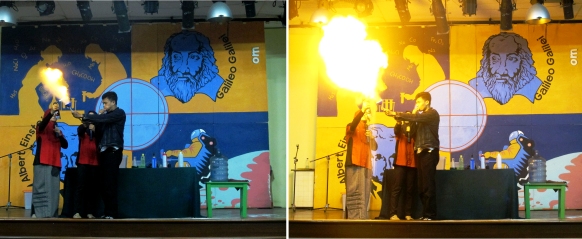 Di Pusat Peragaan IPTEK TMII ini, gak cuma bisa mainin alat peraga. Tapi kami bisa nonton pertunjukan dan ada demo sains juga, salah satunya di auditorium. Di sini sains diperagakan secara sederhana dan interaktif dengan pengunjung. Selain demo sains, sebelumnya kami disuguhin film tentang sains.