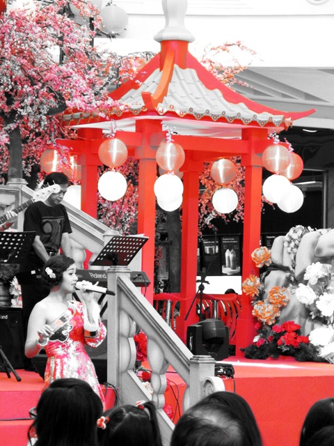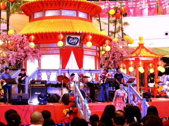 Di Baywalk Pluit, aura Tionghoa sangat kental. Sudahlah ini perayaan imlek, para pengunjung yang datang juga dominan warga keturunan Tionghoa. Belum lagi pengisi acara hiburannya, para pemain sirkus didatangkan langsung dari Tiongkok. Penyanyi Putri Ayu juga lebih banyak menyanyikan lagu berbahasa Tiongkok/Mandarin. Yang menarik juga, band pengiring Putri Ayu ini sangat legend, alias sudah tua-tua, dan asli keturunan Tionghoa. Yang dalam bayangan saya, mungkin semua personil band yang bersahaja ini dulunya seperti yang digambarkan di film-film Hongkong; nge-gank. Atau minimal mereka nakalnya bareng sejak dari jaman mudanya :p
