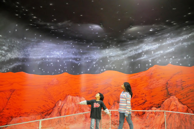 Awal masuk Skyworld, kita bisa jajal ke planetarium dulu. Ukurannya mini, tapi muat untuk puluhan orang. Bisa nonton tata surya dan planet-planet. Lumayan, sambil ngadem setelah panas-panasan di luar.