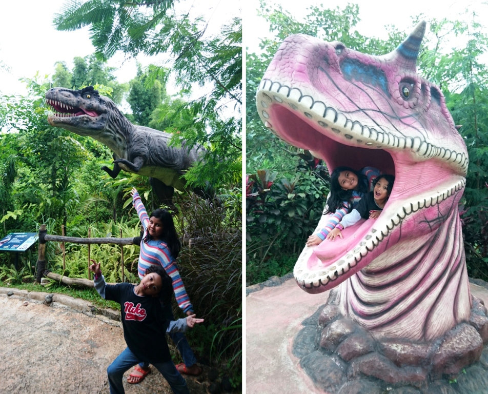 Jagoannya menurut saya di Taman Legenda ini adalah Petualangan Dinosaurus. Anggap aja kita berada di Jurrasic Park. Cuma di sini, dinosaurusnya nggak beneran kayak di film. Tapi biar gitu, si Dino bisa bergerak-gerak dan mengeluarkan suara yang cukup mencekam. Seru-lah. Saya belum pernah masuk wahana kayak gini sebelumnya. Bawa anak-anak lebih seru lagi. Bisa lari-lari dan teriak-teriak mereka, karena heboh ngeliat dino.