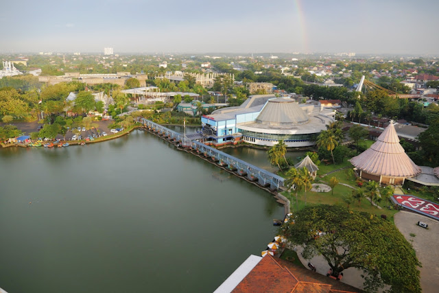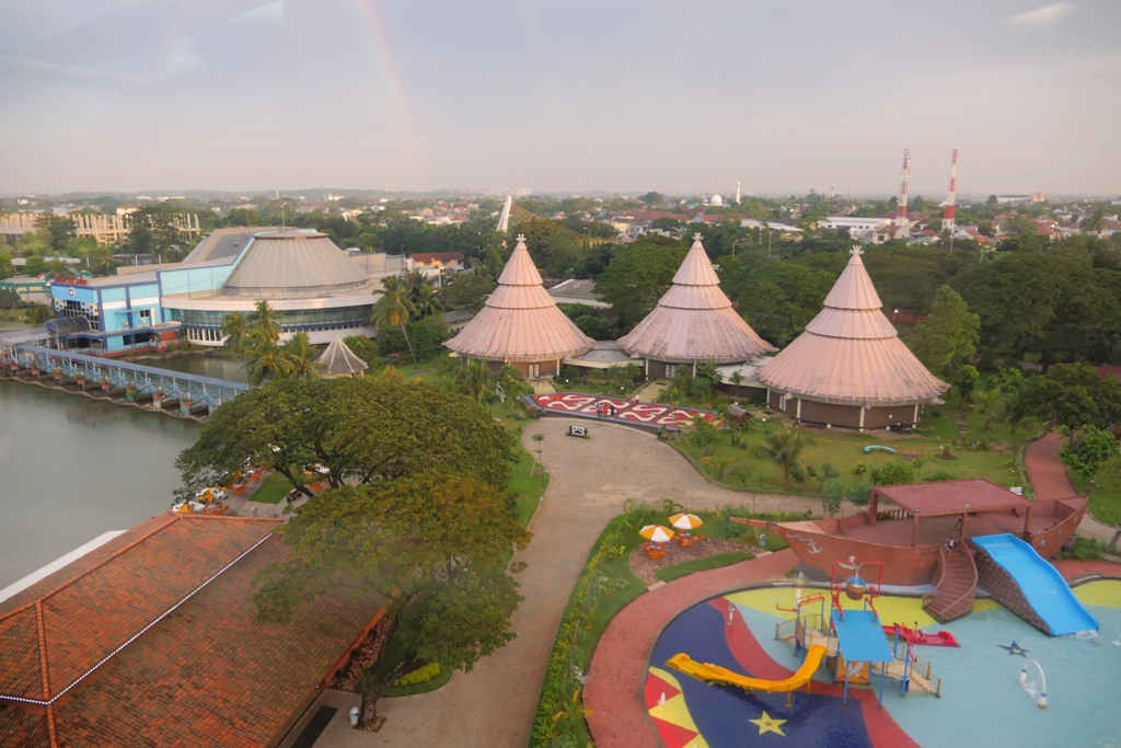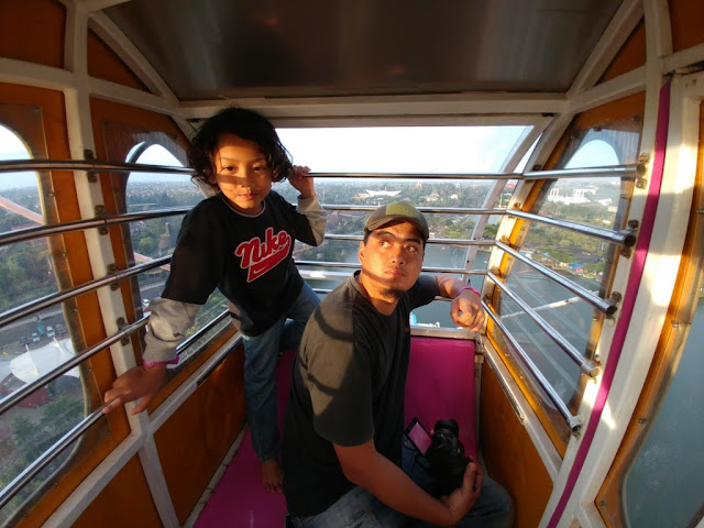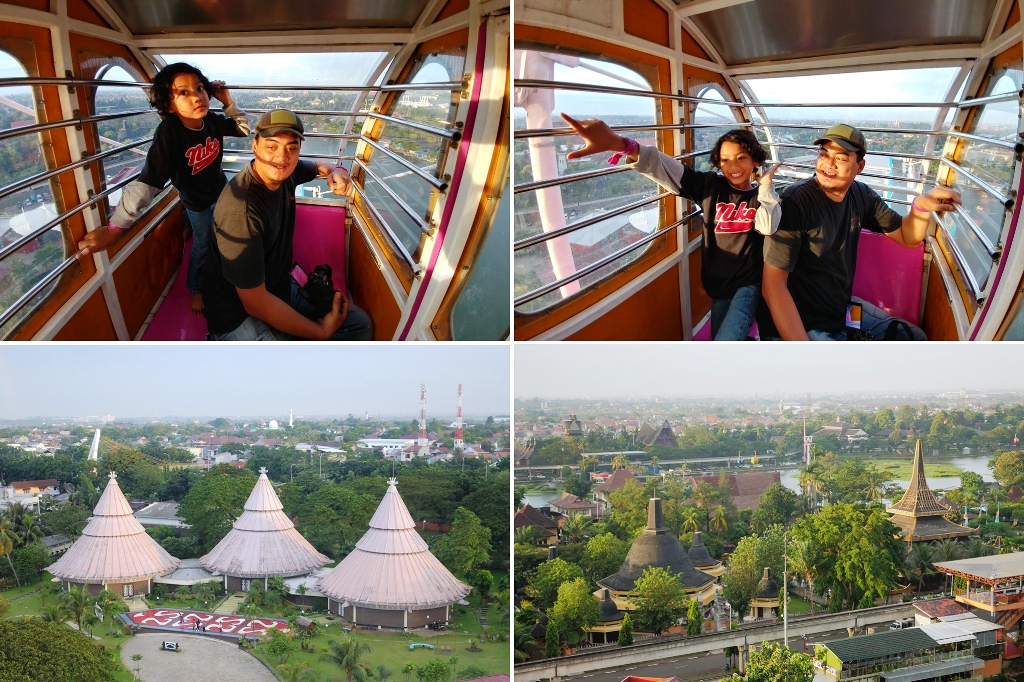 Kami menutup petualangan di Taman Legenda Keong Emas dengan menaiki Mata Legenda alias si kincir ria. Mataharinya pas di mata, cakep juga buat foto-foto dan menikmati lanskap TMII. Apalagi di kejauhan kami bisa melihat pelangi setelah sempat gerimis tadi.
