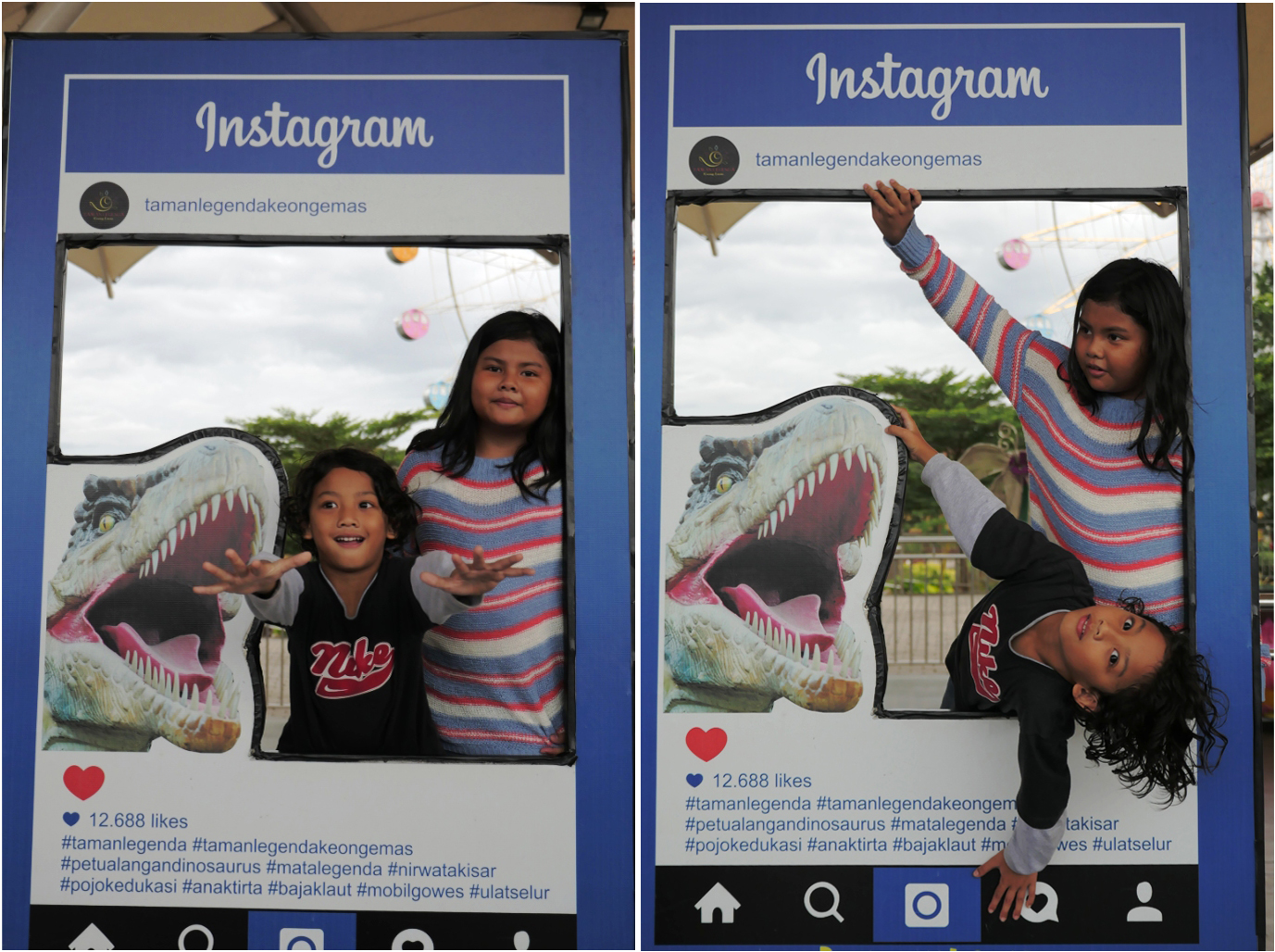 Ada apa di Taman Legenda Keong Emas TMII?? Pertama.. jangan lupa foto di baliho instagram di pintu masuknya. Terus posting di akun instagram pastinya sambil mention akun IG Taman Legenda. Apa gunanya?? nanti kalau postingan ditunjukkan ke petugasnya, kita bisa dapat souvenir menarik. Tapiii perlu dicek lagi, apakah sekarang ini masih berlaku ya. Kalau kami waktu itu dapat sticker atau gantungan kunci ya?? hahaha.. lupa juga.