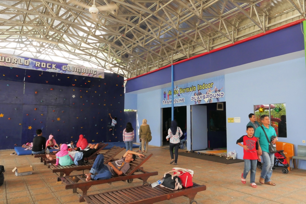 Terus ada wall climbing yang bisa dimanfaatin sama anak. Yang bikin sebel, matras di bawahnya yang mestinya untuk pengaman anak-anak yang manjat, malah dipake tidur-tiduran sama sebagian pengunjung. Ibu-ibu bawa anak kecil. Mau negur gak enak. Tapi kesian ruang gerak anak-anak yang mau manjat pun jadi terbatas. Susah ya emang mendidik pengunjung. Cuma bisa ngelus dada akhirnya.