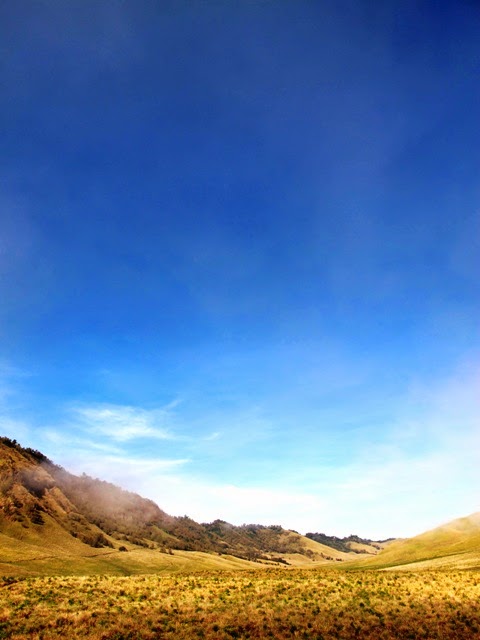 Langit biru di atas gunung, dengan kabut yang masih tebal, tidak cocok jika beriringan dengan segala kesedihan. Maka, tersenyumlah…!
