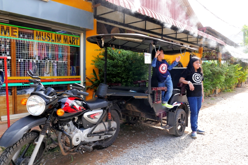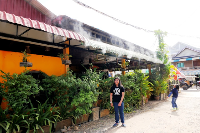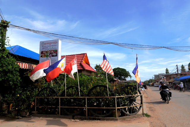 Mungkin gara-gara benderanya yang menarik, kami memutuskan makan malam nanti di tempat ini. Setelah puas jalan-jalan ke tempat lain dulu tentunya. Yang menarik juga buat Lana dan Keano, di sini ada uap air yang disemprotin dari atap resto. Duh segernya, di tengah siang bolong yang mentereng, dan berdebu ala Siem Reap.
