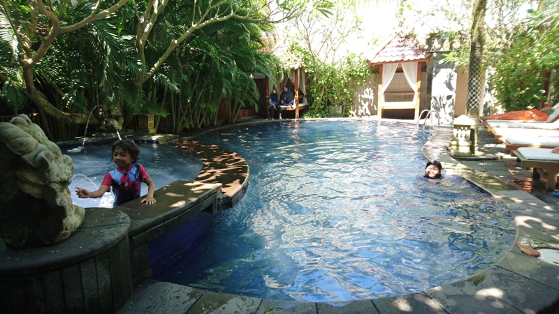 Hampir tengah hari, waktunya balik hotel dan check out. Tapi sebelumnya puas-puasin dulu berenang di kolam hotel, sekalian bilas dan mendinginkan badan setelah berpanas-panasan di perahu dan jalan kaki.