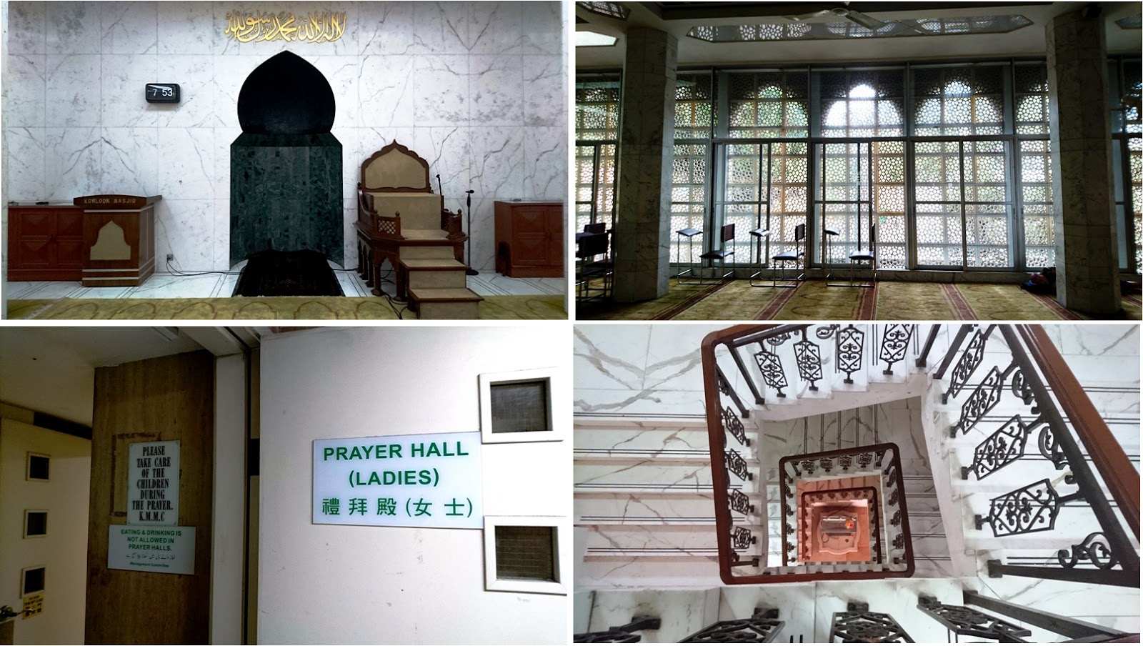 Masjid Kowloon didirikan tahun 1896, dan sempat dipugar karena kerusakan konstruksi akibat pembangunan MTR bawah tanah di akhir tahun 70-an. Setelah dibuka lagi di tahun 1984, masjid ini tetap berdiri dan menjadi salah satu masjid utama di Hong Kong. Dengan ciri khas marmer putih, masjid ini terlihat kokoh. Tapi memang sekilas, interior bangunannya terkesan cenderung ‘tua’.