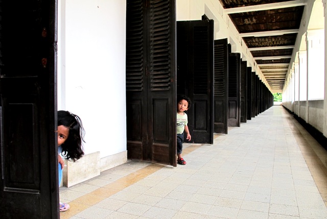 Di sini Lana dan Keano juga bisa anteng main dan jalan-jalan. Nggak kepanasan. Karena selain sirkulasi udara dari banyak pintu atau jendela, gedung ini juga punya sistem AC alami. Tersangkanya adalah ruang bawah tanah, ruang yang dulu pernah dijadiin penjara oleh Jepang. Ruang bawah tanah ini selalu menyimpan air. Jadi air di bawah mendinginkan lantai dan ruangan di atasnya. Demikian kata mas-mas pemandunya, yang tetap lincah mendampingi dan menunjukkan sudut-sudut Lawang Sewu.