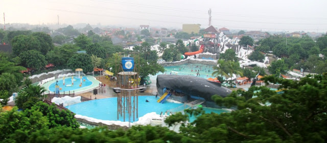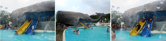 Sedikit kecewa karena gak bisa nyoba semua wahana Snow Bay, berikutnya pindah ke bagian kolam yang ada ember tumpahnya. Kolam cetek yang memang cocok buat anak-anak. Secara umum, gak ada bedanya sama di waterpark lain. Yang ngebedain cuma suasananya saja dan tentu saja si patung paus yang ngejogrog gede di tengah kolam. Patung paus raksasa yang sekaligus jadi tempat seluncuran bocah.