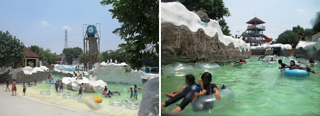 Seperti biasa setiap ke waterpark yang ada kolam arusnya, biasanya kolam arus ini jadi wahana pertama yang kami jajal. Maksudnya sih selain buat nyantai pemanasan, juga buat penjajagan lokasi dulu. Muter-muter ngambang pakai ban lihat-lihat lokasi, sambil ngincer wahana selanjutnya. Karena kolam arus ini biasanya muterin kawasan, dan lewatin wahana-wahana lainnya.
