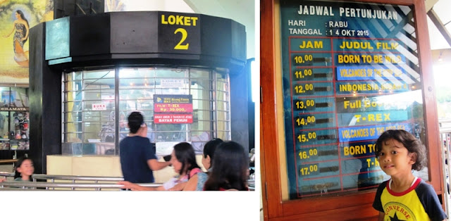 Nonton film T-Rex, karena memang cuma film itu yang masih ada jamnya. Bayar 30 ribu per orang, anak-anak 3 tahun ke atas bayar penuh. Lumayan lah, sekitar 20 menit nonton sambil istirahat. Bukan cuma keong emasnya yang jadul, filmnya juga sudah jadul.