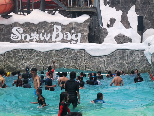 Snow Bay, dari namanya saja sudah bisa ditebak kalau wahana ini bernuansa salju. Bernuansa dingin, seperti berada di negara-negara musim dingin atau beriklim sub tropis. Pegunungan es –tentunya buatan– yang menggambarkan kekokohan dan suasana dingin, jadi set atau pemandangan khas dan dominan di Snow Bay. Secara disain, Snow Bay asyik buat dilihat.