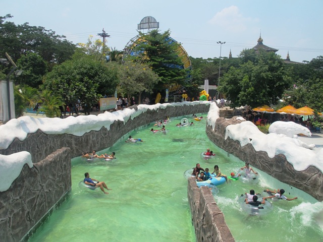 Lana dan Keano anteng main di sini. Sesekali berenang, kadang nyelem. Tapi selebihnya, lebih banyak nangkring di ban ngikutin arus. Enak memang, kolam arusnya termasuk lebar, dan pemandangannya beda. Dikelilingi dinding batu ala pegunungan yang dibaluti salju. Tapi walaupun secara set ada di pegunungan salju yang dingin, muter di kolam arus ini ternyata lama-lama panas juga. Apalagi pas siang, langsung sinar matahari nabrak kulit.