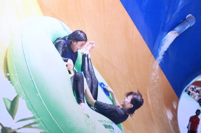 Yang jadi masalah, kalau permainan yang butuh adrenalin gede, anak seumuran Keano biasanya gak boleh. Dan di sini kejadiannya sama, si kecil Keano gak boleh naik hurricane. Jadilah cuma Lana dan Yossie yang naik. Keano jadi supporter saja di sebelah, mulai dari support antre sampai Lana dan Yossie nongol meluncur dari corong.