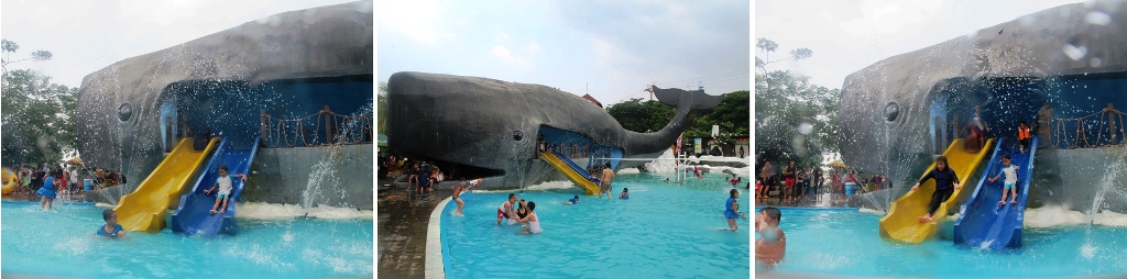 Sedikit kecewa karena gak bisa nyoba semua wahana Snow Bay, berikutnya pindah ke bagian kolam yang ada ember tumpahnya. Kolam cetek yang memang cocok buat anak-anak. Secara umum, gak ada bedanya sama di waterpark lain. Yang ngebedain cuma suasananya saja dan tentu saja si patung paus yang ngejogrog gede di tengah kolam. Patung paus raksasa yang sekaligus jadi tempat seluncuran bocah.