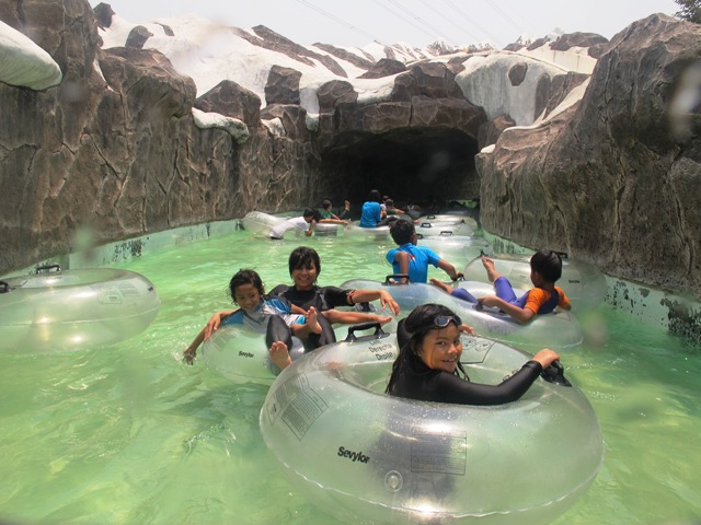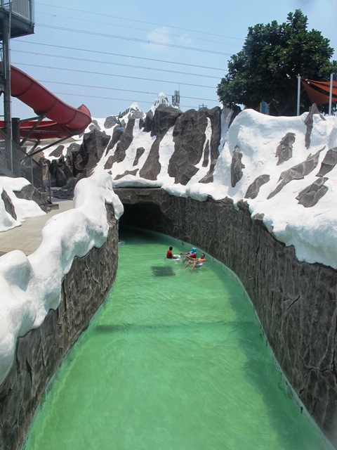 Lana dan Keano anteng main di sini. Sesekali berenang, kadang nyelem. Tapi selebihnya, lebih banyak nangkring di ban ngikutin arus. Enak memang, kolam arusnya termasuk lebar, dan pemandangannya beda. Dikelilingi dinding batu ala pegunungan yang dibaluti salju. Tapi walaupun secara set ada di pegunungan salju yang dingin, muter di kolam arus ini ternyata lama-lama panas juga. Apalagi pas siang, langsung sinar matahari nabrak kulit.