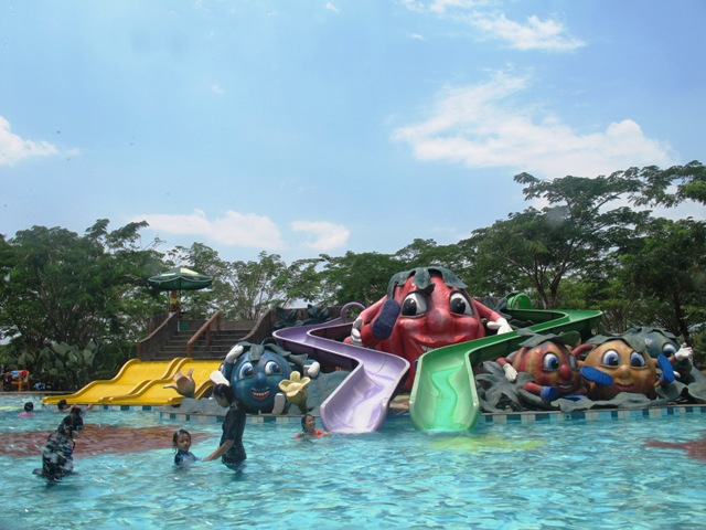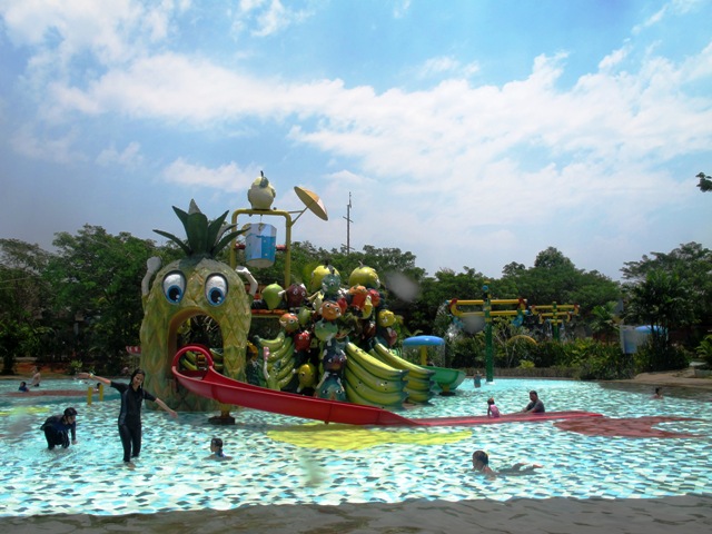 Apa bedanya Water Kingdom dengan waterpark lain? Yang jelas temanya beda. Sesuai dengan taman buah Mekarsari, temanya tentu buah-buahan. Ada nanas, pisang, apel dan lainnya. Saya gak ngecek, apakah salak ada juga.