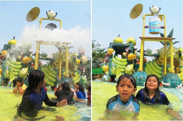 Wahana lain, kayak ember raksasa juga gak ketinggalan ada di sini. Salah satu yang disukai Lana dan Keano, duduk terus disiram air yang tercurah macam air bah dari atas.