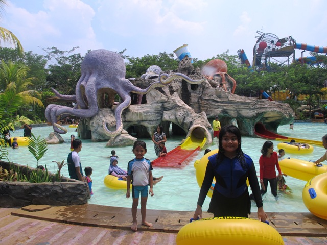 Selain bertema buah-buahan, tenyata Water Kingdom juga punya wahana bertema makhluk laut. Octopus Splash Pool. Anak-anak pasti suka, karena yang satu ini didisain khusus untuk mereka bermain. Ada gurita raksasa yang seolah menguasai sejumlah seluncuran kecil di bawah tentakel-tentakelnya.