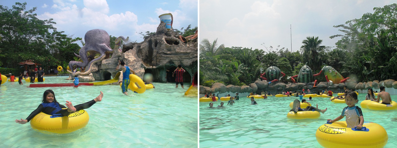 Lazy river di sebuah waterpark, is a must. Ini sih analisa saya. Karena setiap waterpark kayaknya punya kolam arus lambat ini. Pengunjung bisa nyantai di atas ban keliling ngikutin arus air.