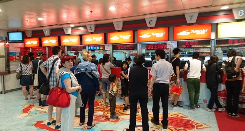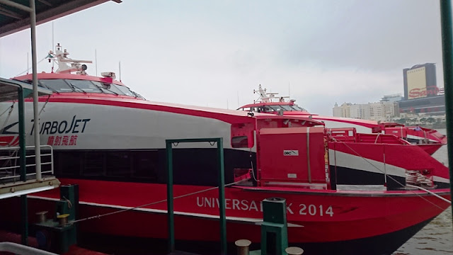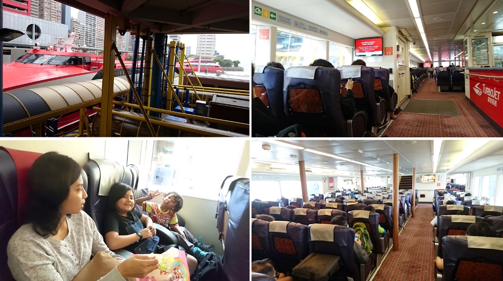 Semua ferry menuju Makau adalah kapal cepat. Ada beberapa operator yang melayani penyeberangan antar wilayah administratif Cina ini. Kami memilih naik Turbo Jet Ferry. Alasannya semata-mata kapal ini yang paling cepat berangkat sesuai dengan waktu kedatangan kami di terminal. Stasiun MTR, pelabuhan ferry, menyatu dengan pusat perbelanjaan Shun Tak Centre. Sambil menunggu kapal berangkat, bisa belanja atau nongkrong di sejumlah resto dan cafe yang tersedia. Cuma pastikan sediakan waktu untuk melewati meja imigrasi keluar Hong Kong serta boarding. Waktu itu, jadwal nyebrang kami sebenarnya jam 2 siang. Tapi, ferry yang berangkat sebelumnya ternyata masih kosong. Kebetulan juga kami sudah stand by di boarding room. Oleh petugas, kami pun diizinkan ikut berangkat duluan. Begitu juga dengan sejumlah penumpang lain yang sudah siap. Lumayanlah, jadi gak perlu nunggu terlalu lama.