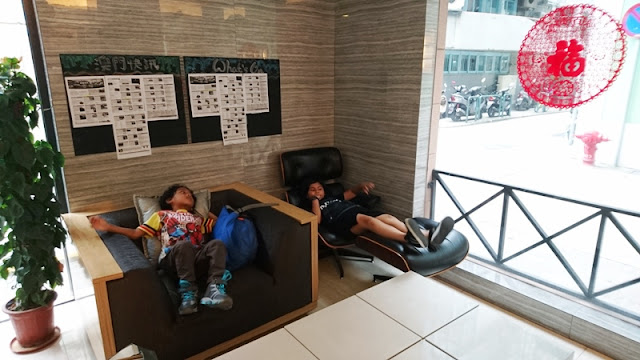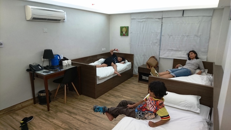 Hotel kami sebenernya adalah 5footway.inn. Penginapan kecil yang rapi, bersih, dengan konsep modern minimalis. Lana dan Keano gak kecewa gak jadi nginep di hotel bintang 5. Di lobby penginapan, mereka masih bisa asik selonjoran sambil menunggu saya check in. Begitu melihat kamarnya juga seru. Ada tiga tempat tidur dengan desain yang menarik buat Lana dan Keano. Dua bocah ini langsung rebutan, ngetake tempat masing-masing.