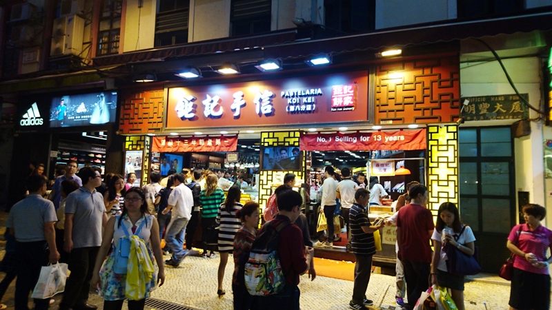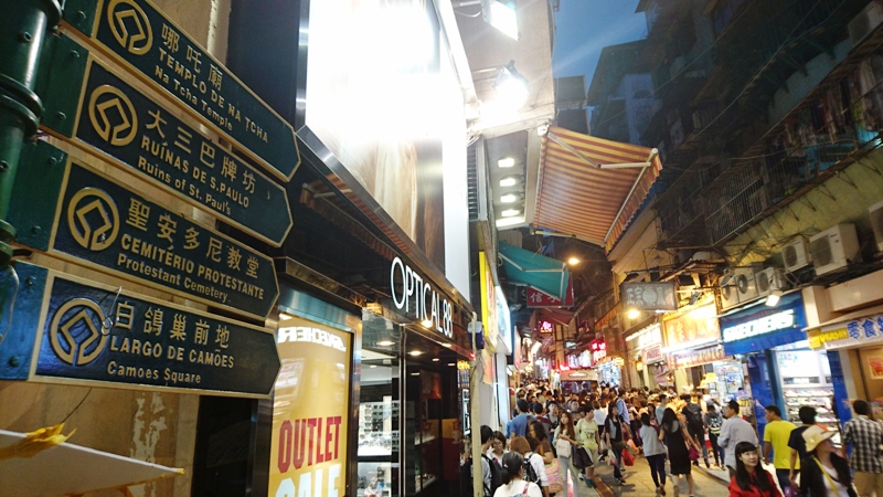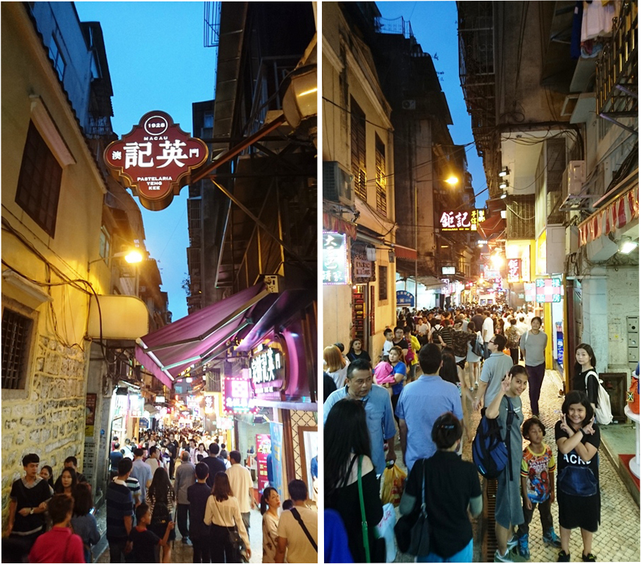 Malam tiba. Menyusuri jalan-jalan kecil di Makau semakin seru. Suasananya benar-benar meriah. Saya dan suami senengnya memang jalan kaki kemana-mana. Jalan-jalan kecil di kawasan pusat sejarah Makau seolah menjadi pasar malam. Mulai dari toko pakaian, parfum, peralatan mandi, sampai jajanan semua bikin lapar mata.