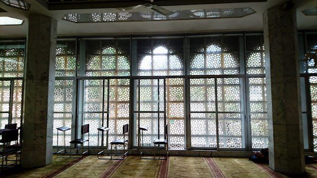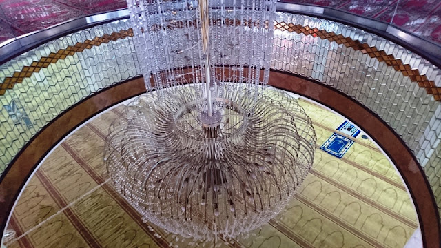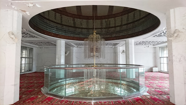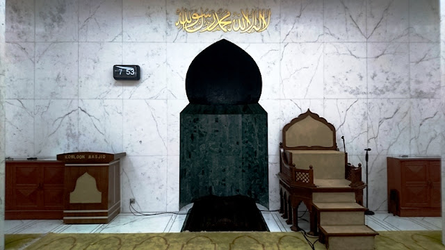 | Interior masjid, dengan marmer yang mendominasi tiang dan tembok |