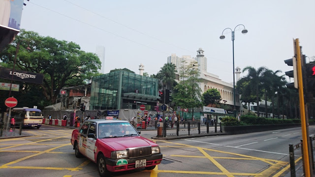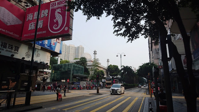 | Masjid dilihat dari area depan Chungking Mansion, penginapan populer di kalangan traveler backpacker |