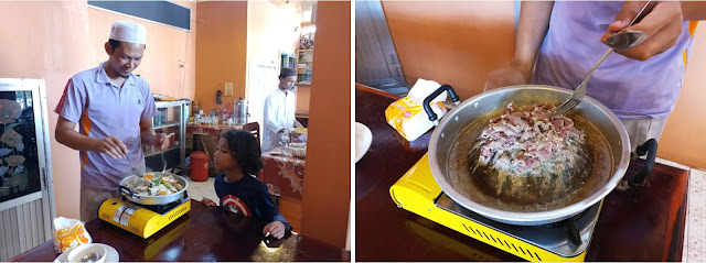Memasak Lembu Naik Bukit dilakukan di hadapan pengunjung. Makanya jadi tontonan yang menarik buat Lana dan Keano. Selama dimasak, si daging dan sayuran di naik turunin “bukit” berulang-ulang sampai matang. Proses masaknya sekitar lima menit. Setelah masakan siap, barulah dihidangkan panas-panas, lengkap dengan kompornya di meja makan.
