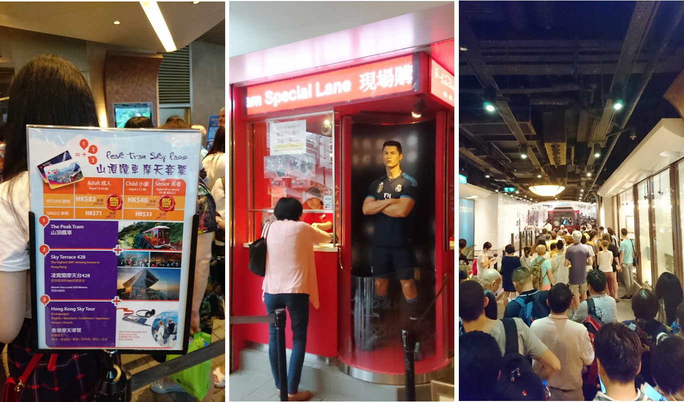 Lanjut ya, ada apa sih di terminal tram ini? Ada tempat membeli tiket tentunya. Tapi bukan cuma tiket tram. Di sini dijual juga tiket masuk museum Madam Tussauds Hong Kong. Kalau beli tiket paketan lebih murah. Tapi, kalau gak tertarik masuk ke tempat yang menampilkan aneka patung lilin orang terkenal itu, ya mending gak usah. Kayak kami waktu itu. Cukup beli tiket naik tram aja. Oiya, satu lagi. Selain paket Madam Tussaud juga ada paket masuk ke Sky Terrace, semacam pelataran untuk menikmati panorama Hong Kong 360°. Menguatkan hati, kami gak beli paket itu. Mahal soalnya hehehe… gambling aja nanti di atas, siapa tau nemu sudut yang cakep buat menikmati pemandangan dari puncak. Kami juga bersyukur, tiket anak harganya jauh lebih murah dari tiket orang dewasa. Lebih lengkap soal harga tiket, bisa tengok di situs ini