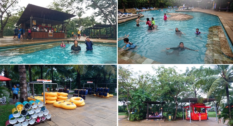 Waterbom ini lumayan teduh. Banyak pohon sehingga bisa mengurangi panasnya matahari. Lagi pula pas kami ke sana cuaca juga mendung. Baru kelar hujan. Jadi amanlah kulit dari bahaya gosong.