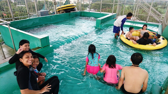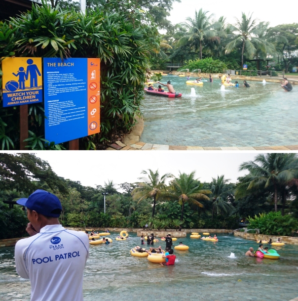 Petualangan di Waterbom PIK dimulai dari kolam arus. Kolam yang terhubung dengan The Beach, yang ombaknya malu-malu kucing, kecil. Naik ban yang disediakan gratis, kita bisa mengapung mengikuti arus. Nyantai sekaligus penjajakan awal melihat keseluruhan area waterpark.