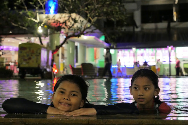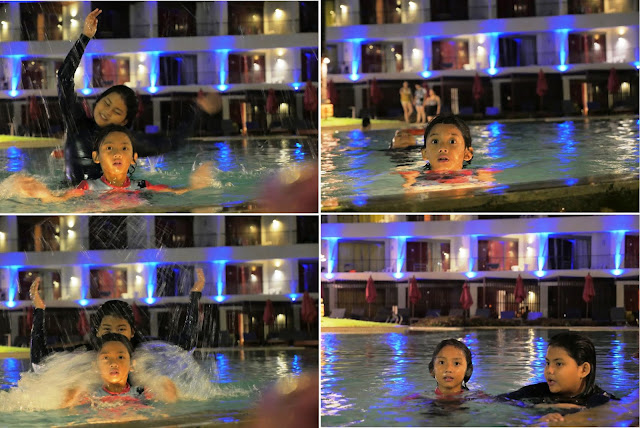Hari pertama setelah jalan-jalan keliling Phuket dan selesai makan malam, anak-anak mau cepet balik ke hotel. Targetnya, pengen cepat berenang di kolam renang hotel.Kolam renang di sini memang buka sampai malam, tapi dibatasin cuma sampe jam 10 malem saja kalau nggak salah. Meskipun pantai letaknya cuma beberapa langkah ke depan. Kolam renang tetap rame saja digunakan sama penghuninya, baik siang maupun malam.